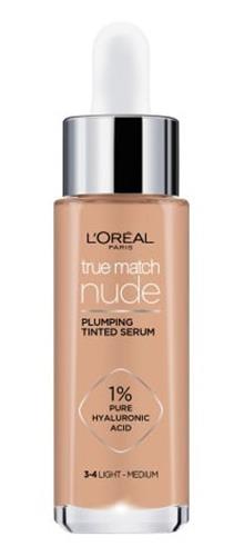 - Bij Bol.com kun je L'Oréal Paris True Match Nude Volumegevend Getint Serum Foundation met hyaluronzuur - 3-4 Light Medium - 30ml - Vegan kopen voor de prijs van € 12,50. Dit is vandaag de goedkoopste webshop.
