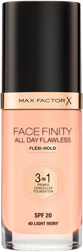 - Bij NiceBeauty kun je Max Factor Facefinity All Day Flawless 3-in-1 Liquid Foundation - 040 Ivory kopen voor de prijs van € 20,62. Dit is vandaag de goedkoopste webshop.
