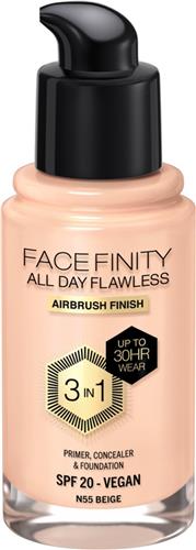 - Bij Bol.com kun je Max Factor Facefinity All Day Flawless Foundation - N55 Beige kopen voor de prijs van € 12,00. Dit is vandaag de goedkoopste webshop.
