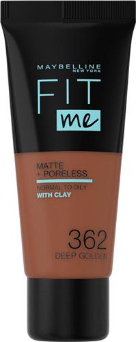 - Bij Bol.com kun je Maybelline New York - Fit Me Matte + Poreless Foundation - 362 Deep Golden - Medium Dekkende Foundation met Matte Finish voor de Normale tot Vette Huid - 30 ml kopen voor de prijs van € 6,00. Dit is vandaag de goedkoopste webshop.