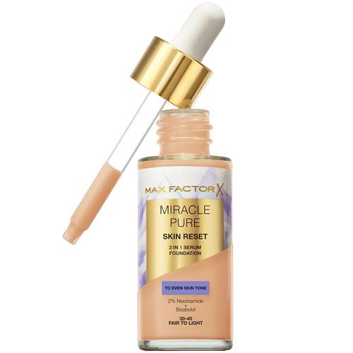 Ervaar de perfectie met de Max Factor Miracle Pure 2in1 Skin Reset Serum Foundation van 30 ml. Deze 2-in-1 serumformule gecombineerd met een vloeibare foundation zorgt direct voor een perfectionerende dekking en een egalere teint. Verrijkt met een reset complex van 2% niacinamide en bisabolol, is deze foundation klinisch en dermatologisch getest voor een gezonde uitstraling van de huid. Met een medium dekkend resultaat en een natuurlijke satijnachtige, matte finish laat deze foundation je stralen in 9 verschillende tinten.
