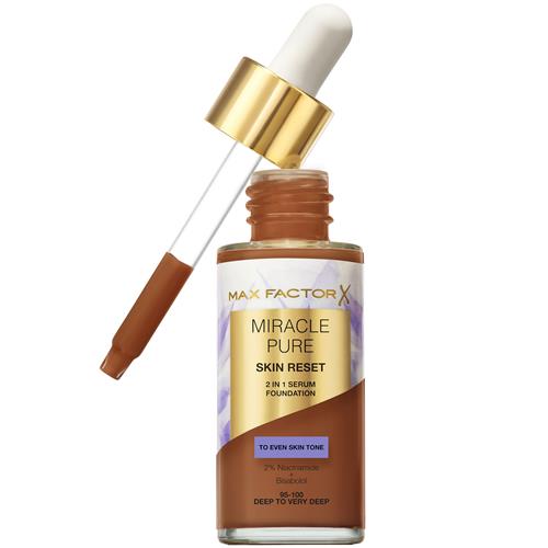Klaar. Reset. Ga! Ontdek de Max Factor Miracle Pure Skin Reset 2-in-1 Serum Foundation. Deze foundation combineert een hydraterend serum met een foundation voor direct een perfectionerende dekking en een egalere teint. De formule is verrijkt met een reset complex van 2% niacinamide en bisabolol, wat zorgt voor een zichtbaar helderdere huid met een gezonde uitstraling.
