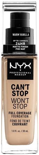 - Bij Bol.com kun je Nyx Professional Makeup Can't Stop Won't Stop Foundation - Warm Vanilla - Volledig Dekkende Foundation - Licht kopen voor de prijs van € 16,05. Dit is vandaag de goedkoopste webshop.