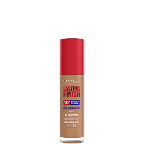 De Rimmel Lasting Finish 35HR Liquid Foundation in de kleur Natural Beige 400 biedt een ongelooflijke hydratatieboost en zorgt voor een langhoudend kleurresultaat tot wel 35 uur. Deze vegan foundation heeft een luchtige formule die de huid optimaal laat ademen en voorziet van een hoogdekkende kleur met een natuurlijke finish. De formule is verrijkt met hyaluronzuur, vitamine E en 2% niacinamide, wat klinisch bewezen is om de uitstraling van de huid te verbeteren.